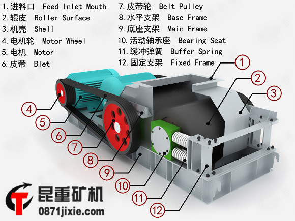 對輥式破碎機(jī)工作時(shí),破碎物料經(jīng)給料口落入兩輥?zhàn)又g,進(jìn)行擠壓破碎,成品物料自然落下。若遇過硬或不可破碎物時(shí),對輥式破碎機(jī)的輥?zhàn)涌蓱{液壓缸或彈簧的作用自動(dòng)退讓,使輥?zhàn)娱g隙增大,過硬或不可破碎物落下,從而保護(hù)機(jī)器不受損壞。相向轉(zhuǎn)動(dòng)的兩輥?zhàn)佑幸欢ǖ拈g隙,改變間隙,即可控制產(chǎn)品最大排料粒度。雙輥破碎機(jī)是利用一對相向轉(zhuǎn)動(dòng)的圓輥,四輥破碎機(jī)則是利用兩對相向轉(zhuǎn)動(dòng)的圓輥進(jìn)行破碎作業(yè)。