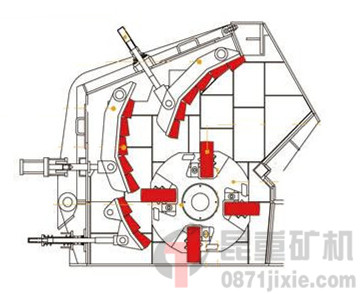 反擊式破碎機是一種利用沖擊能來破碎物料的破碎機械。本機工作時,在電動機的帶動下,轉子高速旋轉,物料進入板錘作用區時,與轉子上的板錘撞擊破碎,后又被拋向反擊裝置上再次破碎,然后又從反擊襯板上彈回到板錘作用區重新破碎,此過程重復進行,物料由大到小進入一、二、三反擊腔重復進行破碎,直到物料被破碎至所需粒度,由出料口排出。調整反擊架與轉子之間的間隙可達到改變物料出料粒度和物料形狀的目的。