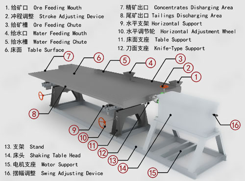 礦粒群從6s搖床床面上角的給礦槽送入,同時由給水槽供給橫向沖洗水,于是礦粒在重力,橫向流水沖力,床面作往復不對稱運動所產生的慣性和摩擦力的作用下,按比重和粒度分層,并沿床面作縱向運動和沿傾斜床面作橫向運動。比重和粒度不同的礦粒沿著各自的運動方向逐漸扇形流下,分別從搖床精礦端和尾礦側的不同區(qū)排出,最后被分成精礦,中礦和尾礦。