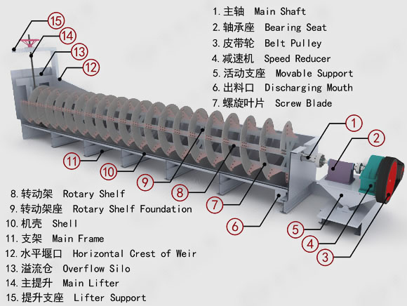 高堰式螺旋分級機采用將磨細(xì)后的礦漿從位于沉降區(qū)中部的進(jìn)料口給入水槽,傾斜安裝的水槽下面是礦漿分級沉降區(qū),螺旋低速轉(zhuǎn)動,對礦漿起攪拌作用,使細(xì)顆粒懸浮到上面,流到溢流堰處溢出。粗顆粒沉到槽底,由螺旋輸送到排料口作為返砂排出。溢流堰的位置高于螺旋軸下端的軸承中心,低于溢流端螺旋上緣。